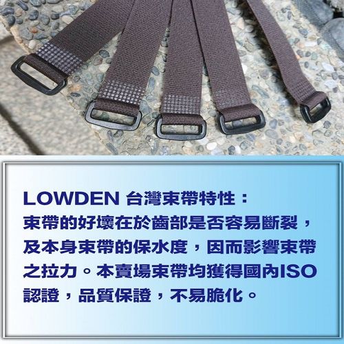 LOWDEN 台灣束帶特性:束帶的好壞在於齒部是否容易斷裂,及本身束帶的保水度,因而影響束帶之拉力,本賣場束帶均獲得國內ISO認證,品質保證,不易脆化。