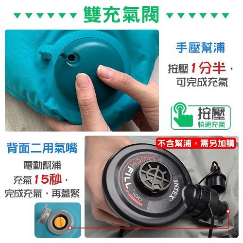 ◆ 背面二用氣嘴,可使用電動幫浦充15秒快速充氣。(電動幫浦需自備)
